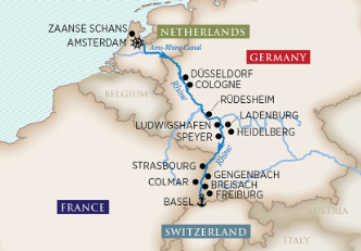 | Itinerary: | Amsterdam (overnight), Dusseldorf, Rhine Gorge, Rudesheim, Ludwigshafen, Strasbourg, Breisach, Basel. | ||||