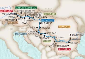 | Itinerary: | Vilshofen (overnight), Passau, Linz, Weissenkirchen, Vienna, Bratislava, Budapest (2 overnights), Mohacs, Vukovar, Belgrade, Iron Gates, Vidin, Rousse, Giugiu. | ||||