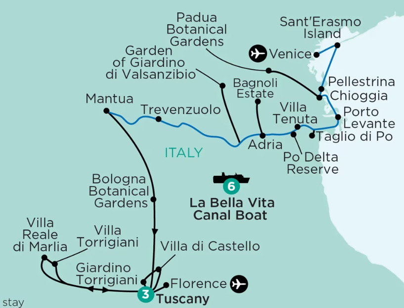 | Itinerary: | Venice, Embark La Bella Vita & Cruise the Venice Canals, Sant Erasmo Island & Canal of the Orphans, Padua Botanic Gardens, Po Delta & Villa Ca'Zen, Adria, Bagnoli Estate & Villa Widmann Borletti, Giardino di Valsanzibio, Ducal Palace of Mantua & Parco Giardino Sigurta, Disembark La Bella Vita, Bologna Sightseeing & Tuscany, Villa Gamberaia, Giardino Torrigiani & Boboli Gardens, Lucca, Villa Torrigiani & Villa Reale di Marlia, Florence. | |||
