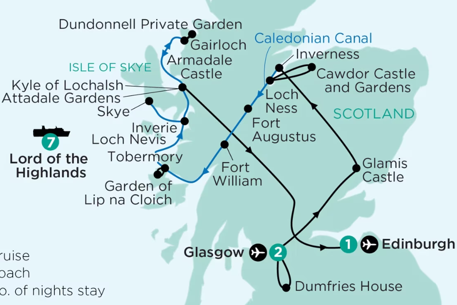 | Itinerary: | Glasgow, Dumfries House, Glamis Castle, Inverness and Embark Lord of The Highlands, Cruise the Caledonian Canal & Loch Ness, Loch Oich, Laggan Ave, Loch Lochy, Neptunes Staircase & Fort William Mountain Gondola, Isle of Mull & Lip na Cloiche Private Garden, Tobermory, Isle of Skye, Armadale Castle & Inverie, Gairloch & Dundonnell Private Garden, Attadale Gardens, Kyle of Lochalsh, Edinburgh. | ||||
