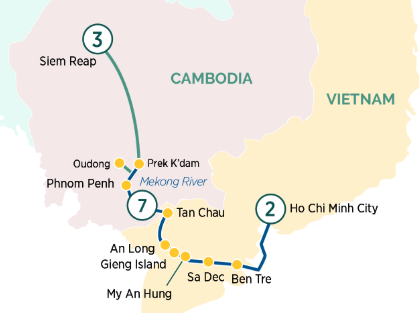 | Itinerary: | 3x Nights Hotel in Siem Reap, Peam Chi Korng, Angkor Ban, Phnom Penh, Tan Chau, An Long, Gieng Island, My An Hung, Sa Dec, Ben Tre, Cho Gao Canal, 2 Night Hotel Stay Ho Chi Minh City. | |||