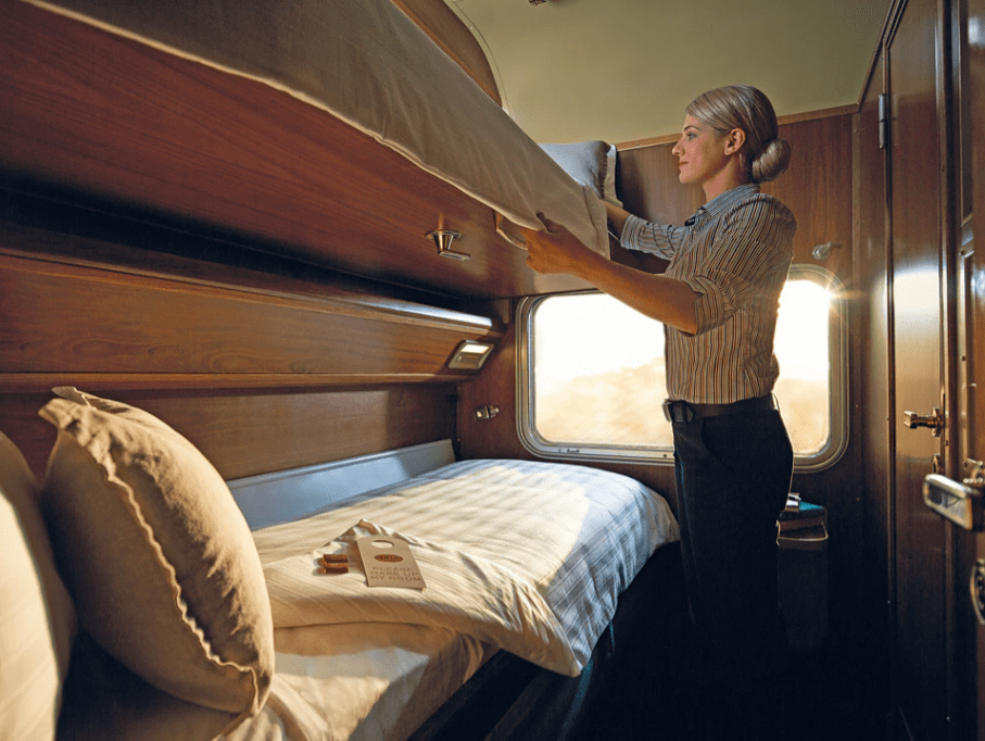 I was in a twin Gold Service cabin. During the day it is a 3 seater sofa and at night, above and below bunk beds. There is a very sturdy ladder to get to the top bunk, which I am told is very comfortable & safe. The cabin has it’s own bathroom facilities with shower, toilet & basin. The very comfortable Outback Explorer Lounge and Queen Adelaide Restaurant carriages are designated for the Gold Service cabins and convey a welcoming art deco style.