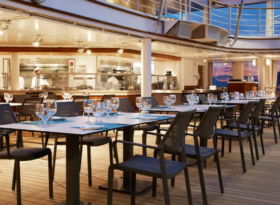 Soft breezes and ocean views beckon at the Grill, especially as the sun goes down when cruise guests gather for cocktails at the outdoor bar and talk about the day’s events.